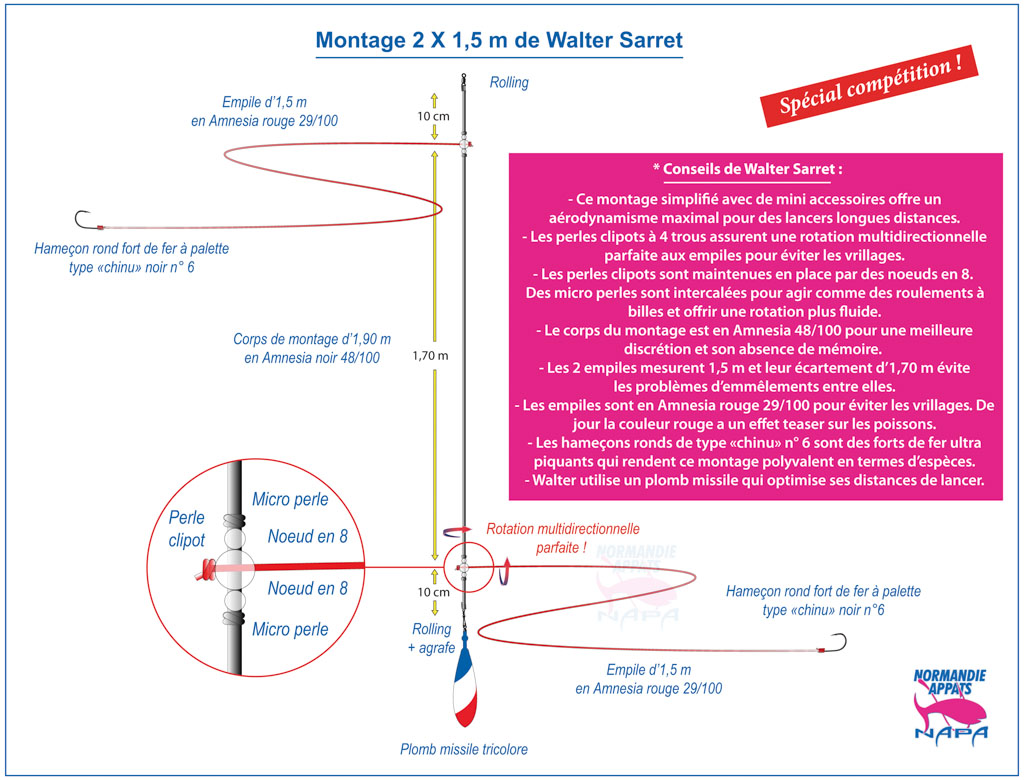 Pour une pêche light des sparidés et du « tout-venant », Walter utilise pour ce concours son montage 2 X 1.5 m. Il sait que celui-ci est assez polyvalent en termes d’espèces – ce qui lui permettra d’engranger un maximum de points. Grace à ses mini-accessoires très aérodynamiques, ce montage permet aussi d’être lancé à de longues distances. Le corps du montage est en Amnesia noir. Comme son nom l’indique, ce nylon offre une impressionnante absence de mémoire – le rendant idéal pour éviter le vrillage et les emmêlements. Sa couleur a été choisie pour un maximum de discrétion. Ce montage est constitué de 2 empiles d’1,5 m en nylon Amnesia 29/100. De jour, leur couleur rouge a un effet teaser et de nuit, celle-ci devient pratiquement invisible. Ces empiles sont dotées d’hameçons ronds à palette de type « chinu » très piquants en taille n°6, - permettant ainsi de toucher un maximum d’espèces.
