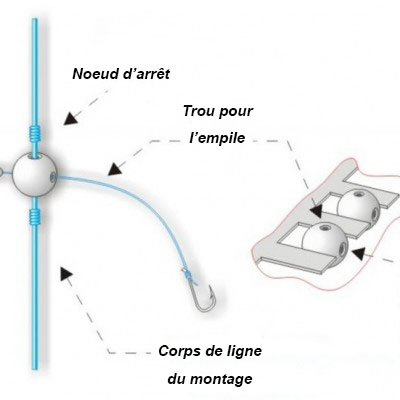 Les perles clipots assurant aux empiles une parfaite rotation sont juste maintenues par des nœuds en 8. Walter était en effet lassé des perles collées car il a constaté qu’elles cédaient souvent en combat. Il intercale également une micro perle de chaque côté de la perle clipot. Celles-ci agissent comme des roulements à billes et offrent ainsi une bien meilleure rotation multidirectionnelle aux empiles - limitant donc les phénomènes de vrillages.