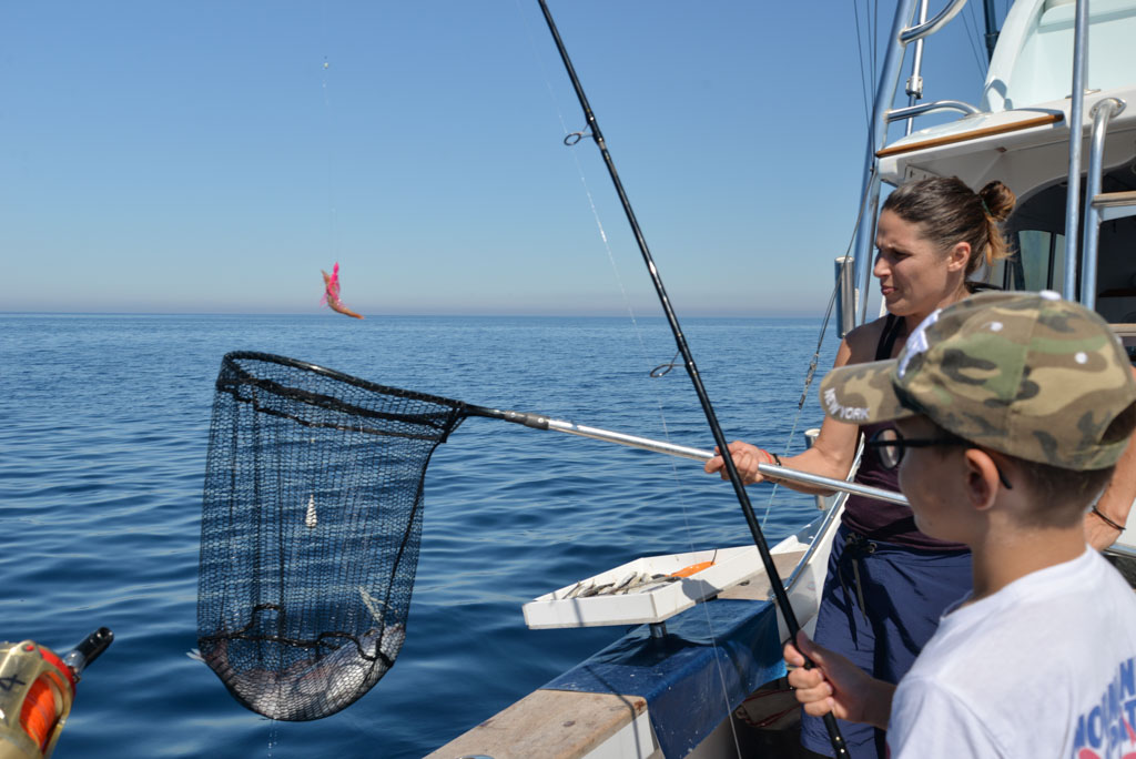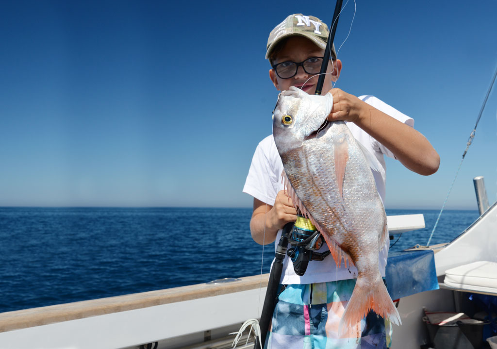 Magali épuisetant un beau pagre pêché par son fils Swan