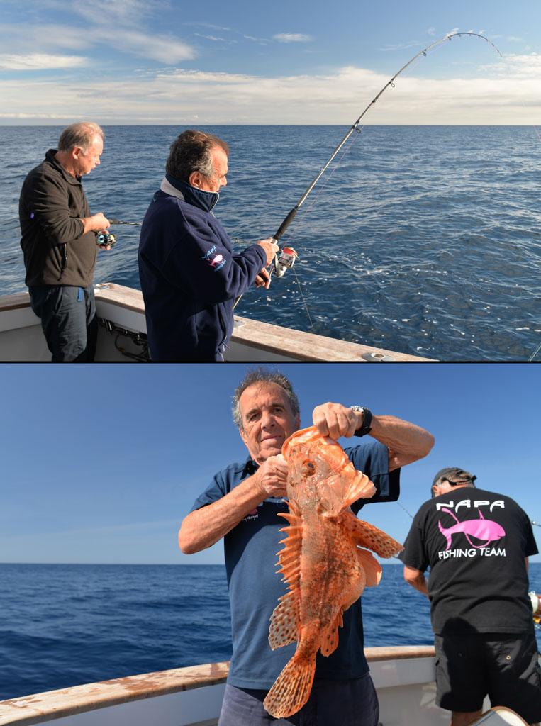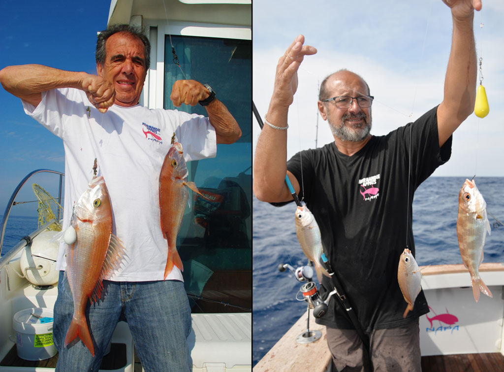 Son avantage sera également de permettre des prises multiples – que ce soit celles d’un pêcheur utilisant un montage à plusieurs empiles ou plusieurs pêcheurs ayant chacun fait un poisson en même temps. Comme exemple, voici sur ces photos Maurice ayant fait un doublé de très gros pageots au Rag (à gauche) et Jean-Pierre qui a pêché un beau triplé au Bibi (2 dorades roses et un pageot).