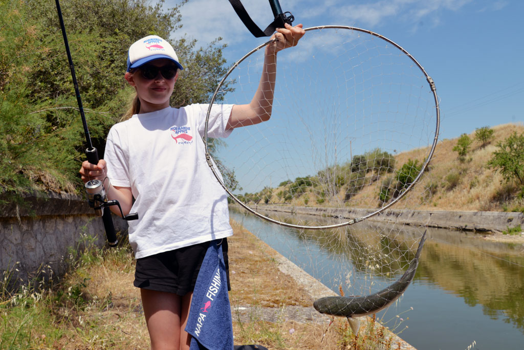 Wanda la petite fille de Daniel posant avec le mulet qu’elle vient de pêcher. Notez qu’elle tient l’épuisette par la tête et dans l’axe – ce qui évite de la casser !