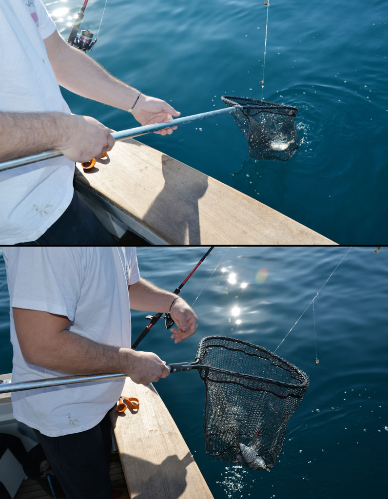 Quand le poisson arrive au bateau, ne le poursuivez surtout pas avec l’épuisette. Le filet oppose de toute façon une très grande résistance à l’eau. De plus, votre prise voyant arriver cet objet massif a alors tendance à l’éviter et à effectuer un nouveau rush. Cela peut occasionner casses et décrochés. En fait, c’est au poisson à aller vers l’épuisette et non l’inverse. L’épuisette doit rester fixe en présentant toute son ouverture et c’est au pêcheur de diriger sa prise vers le filet. L’épuisette restant immobile, le poisson est moins effarouché et il pénètre plus facilement dans le panier. Encore ici, refermez le filet en ramenant le manche à vous dans l’axe et évitez surtout de relever l’épuisette à l’horizontale.
