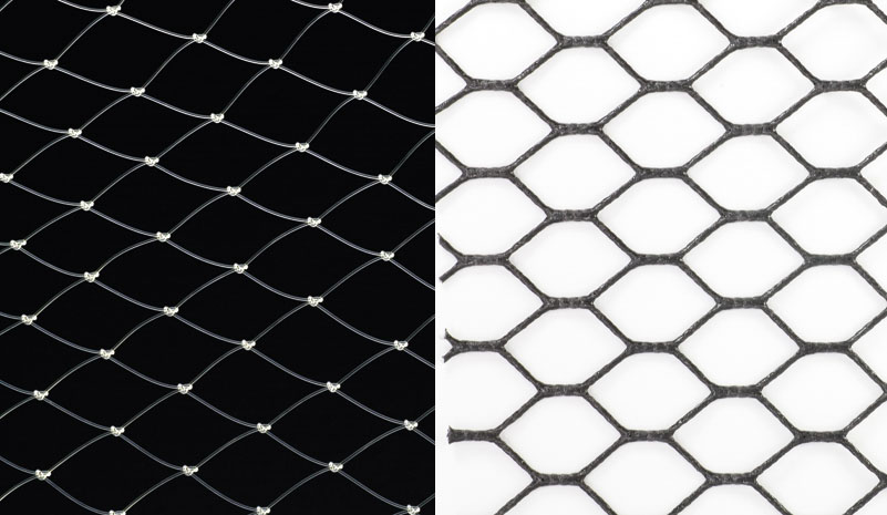 À gauche, un filet en maille nylon. À droite, un filet à mailles caoutchoutées type rubber mesh