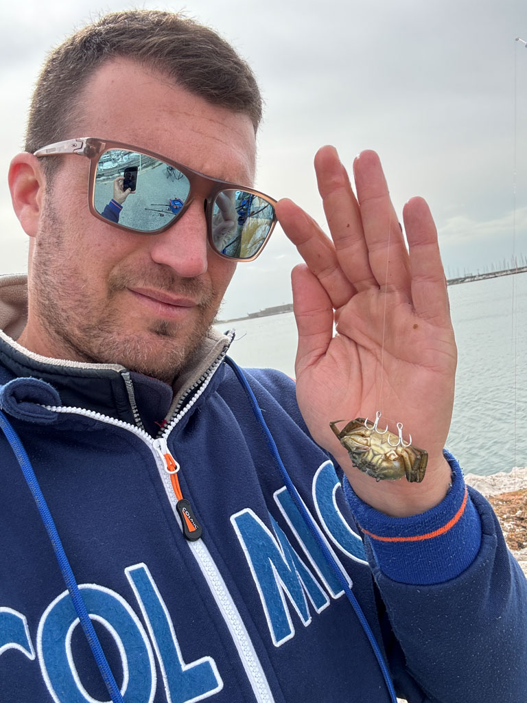 Il espère ainsi gagner en discrétion face aux méfiantes daurades royales. Il a également pris soin de bien laisser 2 pointes bien dégagées de la carapace afin d’optimiser l’autoferrage du poisson.