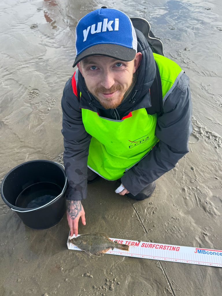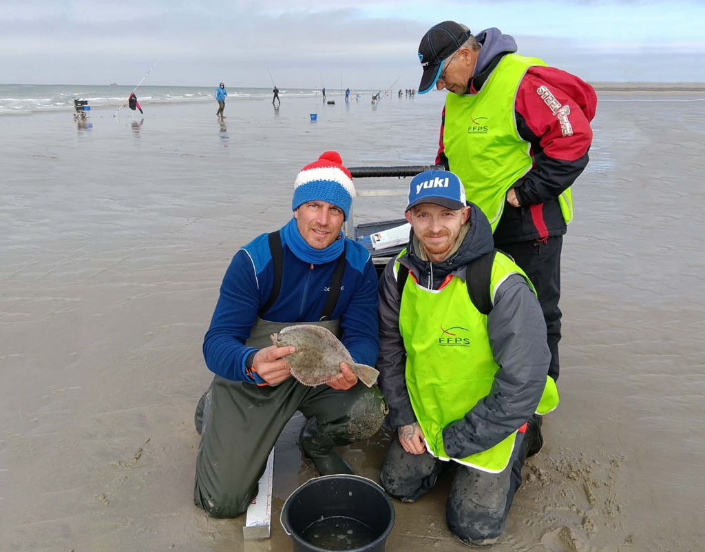 Durant la compétition de présélection de l’équipe de France, Mathieu a pris de nombreux plats avec son montage. Ici, un flet mesuré par un commissaire : 28 cm – soit bien au-dessus de la maille légale !
