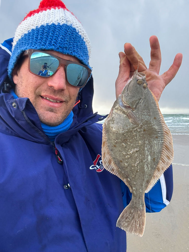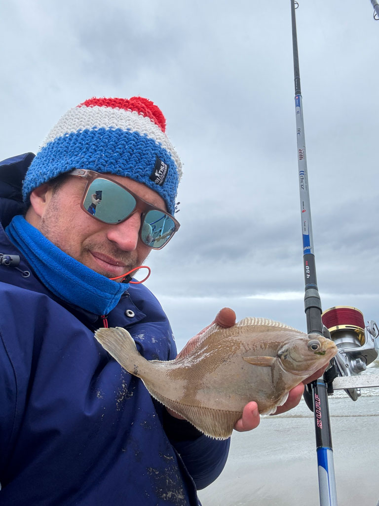 Mathieu avec un magnifique flet pêché à l’arénicole avec son montage cascade