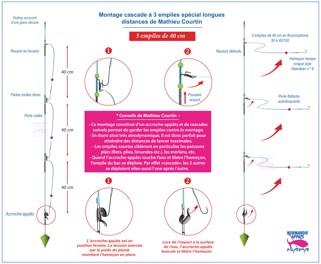 Le principe de ce montage est de ne se déployer qu’une fois qu’il a atteint l’eau. Et comme son nom l’indique, il a la caractéristique de libérer les empiles l’une après l’autre - en cascade donc ! Un effet domino très astucieux qui est quasi automatique ! Ainsi, lorsque l’accroche appâts touche la surface de l’eau, celui-ci libère l’hameçon du bas et l’empile se déploie. Se faisant, il enlève la tension du plomb qui maintenait la seconde empile dans le cascade swivel – la plaquant contre le corps du montage. L’empile du milieu se déploie donc. Et en conséquence, le cascade swivel du haut libère l’hameçon et la troisième empile se déploie. Un déploiement des empiles en cascade !