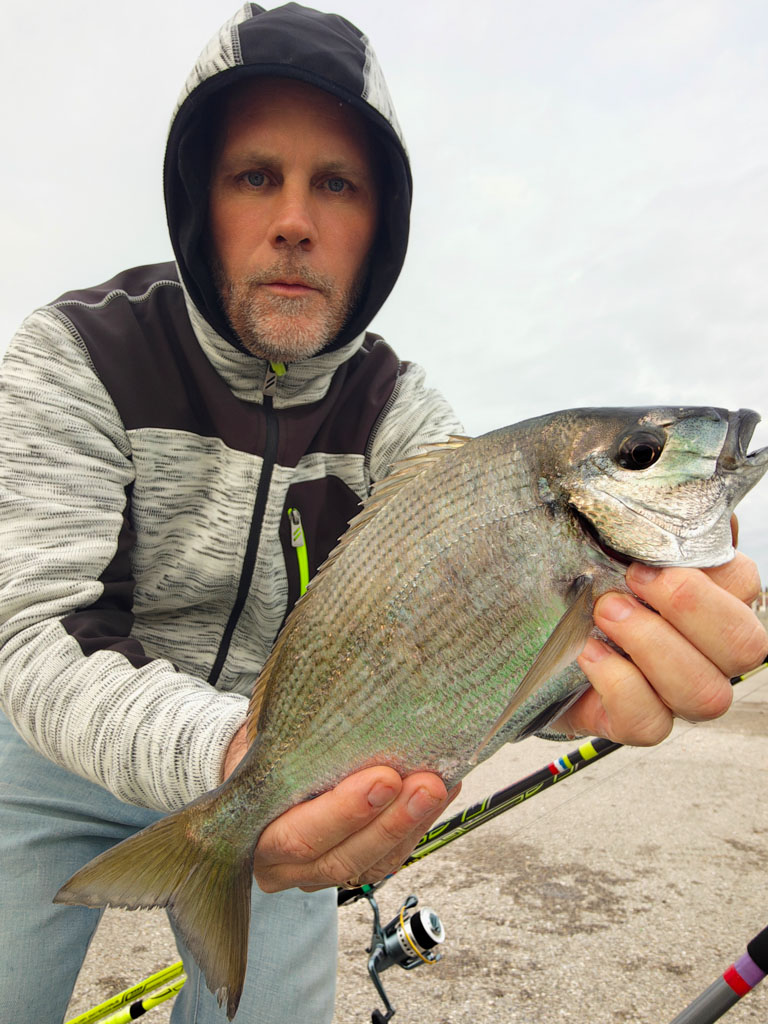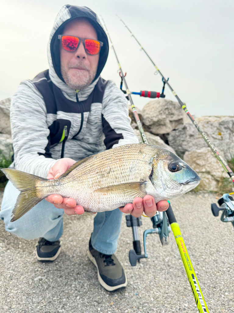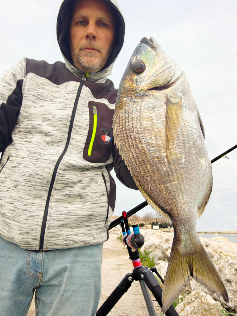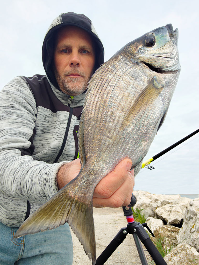 Après quelques heures d’attente sur une de ses digues préférées, Walter encaisse un gros départ. Après le ferrage, il ressent les coups de tête typique d’un sparidé. Il est par contre étonné de sa puissance et de l’intensité des rushs. Et le membre du team Normandie Appâts n’est pas au bout de ses surprises. En effet, dès la mise à l’épuisette, il est étonné de la livrée de ce poisson. Il présente des reflets bleus - violacés sur tout le corps et il porte même un masque de couleur turquoise très prononcé.