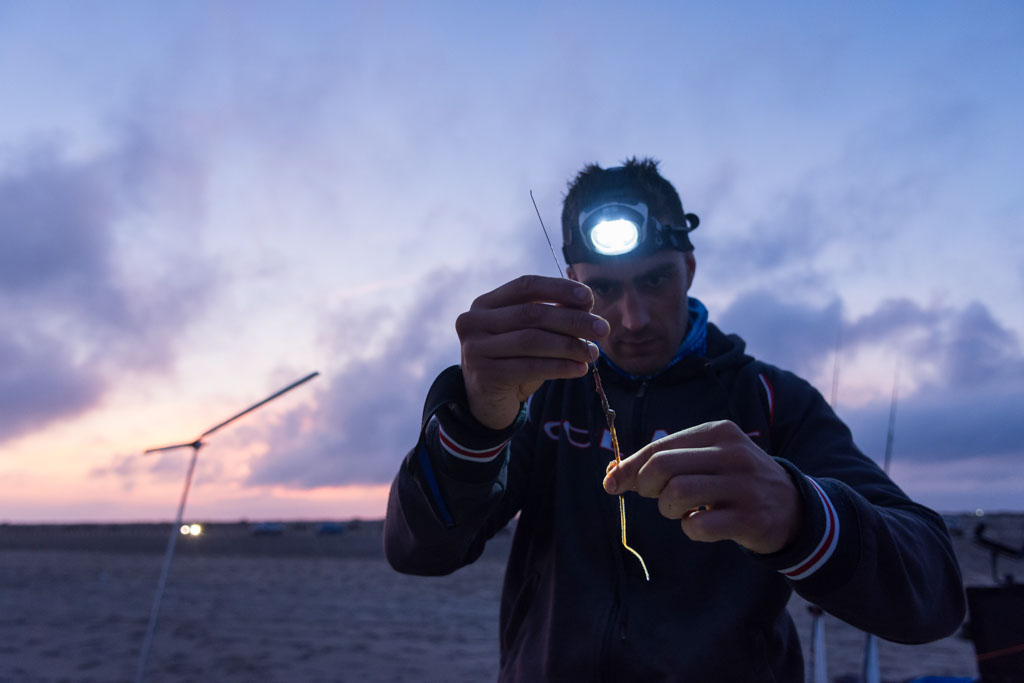 Mathieu Courtin en train d’enfiler un Ver de sable Normandie Appâts sur une aiguille à escher