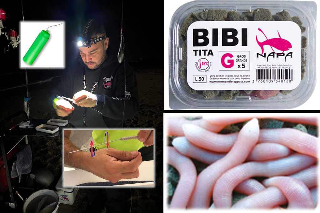 En plus du Ver de Sable Normandie Appâts ou du Bibi ligaturé pour Marc, les membres du team Normandie Appâts n’hésitent pas à utiliser d’autres vers plus charnus pour attirer les plus beaux spécimens de marbrés – surtout en hiver. C’est ainsi le cas du Ver de Chalut qu’ils emploient en petits tronçons enfilés sur l’hameçon à l’aiguille ou encore de l’Américain Normandie Appâts.