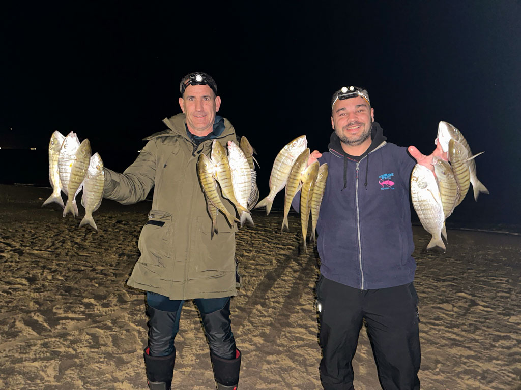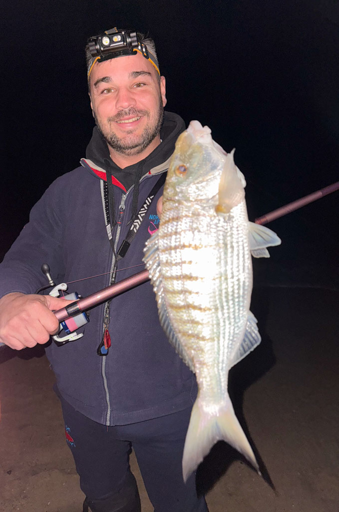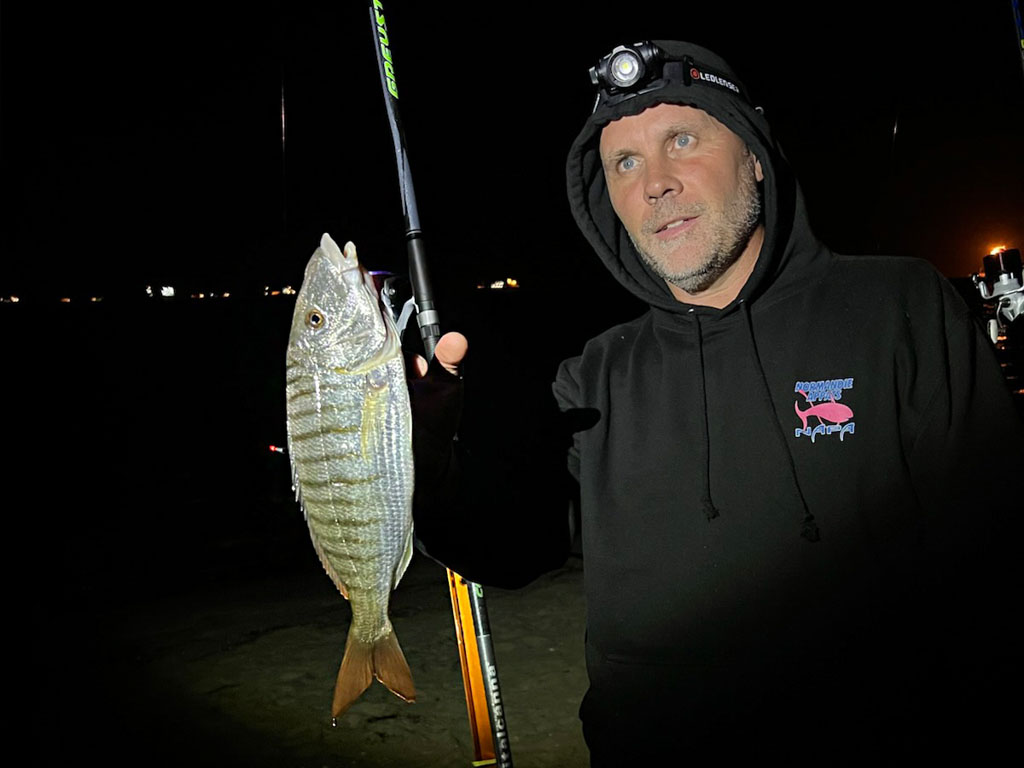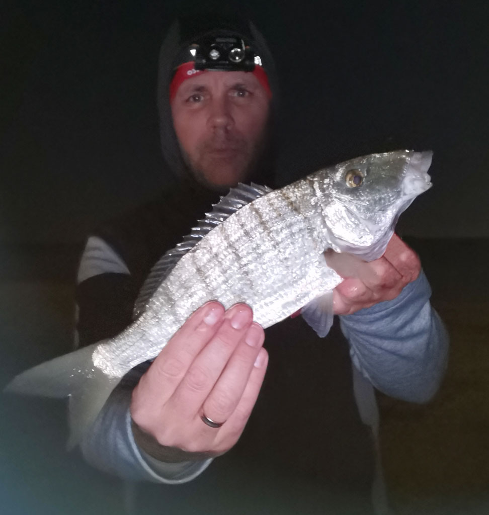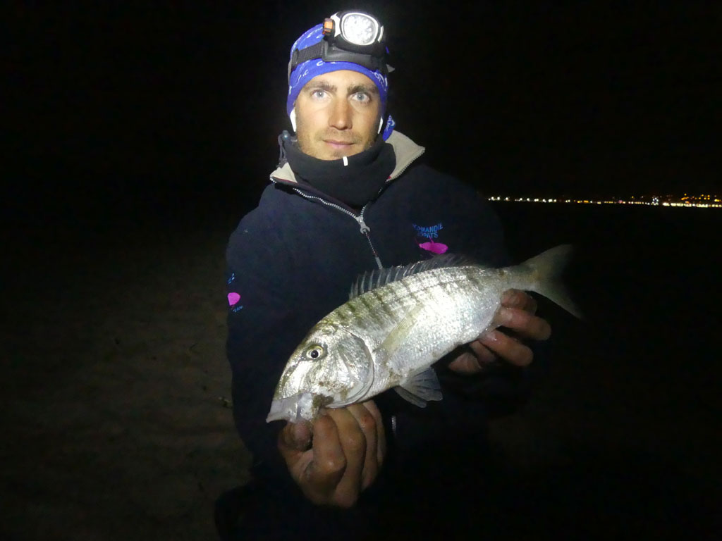 En surfcasting, la marbré est un sparidé que l’on pêche souvent durant les beaux jours d’été et d’automne. Mais peu de pêcheurs savent que c’est généralement en hiver qu’il est possible de toucher les plus gros spécimens. Ainsi, il est fréquent de pêcher les plus beaux marbrés de décembre à fin février. Même s’il est possible d’en prendre de jour (ex : le matin) ou assez près de la rive, ce sparidé se pêche plutôt en surfcasting de nuit et à longues distances. Mesurant en moyenne 20 à 40 cm, il peut atteindre plus de 55 cm – 40 à 50 cm étant déjà un beau coup de ligne ! C’est le poisson typique des grandes plages sableuses et beaucoup d’amateurs estiment que c’est un des poissons rois de la pêche en surfcasting de nuit.