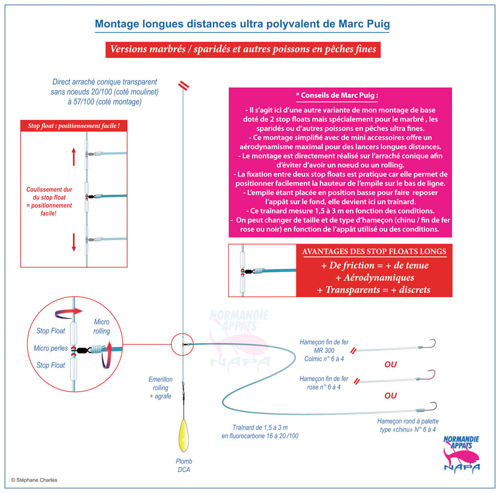 Afin d’avoir un aérodynamisme maximal avec un minimum de traînée dans l’air, ce montage est doté d’un minimum d’éléments et ceux-ci ont été choisis dans les plus petites tailles possibles. Sa base est en fait constituée d’un mini rolling encadré de perles facilitant sa rotation dans toutes les directions. Il est maintenu en place par de petits stop floats longs placés directement sur l’arraché. L’empile peut ainsi être facilement remplacée ou changée rapidement en fonction du poisson recherché ou des conditions rencontrées. Il est possible de la déplacer en hauteur pour avoir une empile en pleine eau (ex : pour le bar, le sar, etc.) ou comme ici en position basse afin d’obtenir un traînard reposant sur le fond. Cette configuration est idéale pour le marbré qui est un poisson fouisseur mais aussi pour d’autres sparidés tels que la daurade royale, le pageot, etc. Pour le marbré, Marc utilise un traînard de 2 m en 16/100 à peine pour avoir un maximum de discrétion avec un hameçon « chinu » de 6 à 4 – voire 2 selon les marques.