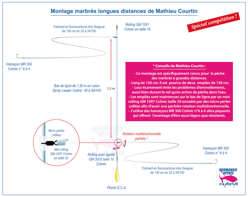 Si Mathieu Courtin utilise aussi l’urfe comme Walter pour pêcher le marbré, il emploie le plus souvent son montage 2 X 1.30 m longues distances issu de la compétition. Afin d’encaisser la puissance du lancer avec des poids compris entre 130 et 170 g, Mathieu utilise en corps de montage du nylon 45 à 50/100. Sa taille d’1,5 m permet de bien armer la canne lors du lancer afin d’atteindre de grandes distances. Le montage est volontairement dépourvu de nœuds pour éviter de le fragiliser – ce qui pourrait entraîner une casse à cause de la pression considérable engendrée par un lancer puissant. Pour la fixation de ses empiles, il utilise un mini rolling maintenu en place par des micro perles collées. Cet ensemble permet une rotation multidirectionnelle parfaite des empiles et minimise les risques d’emmêlements.
