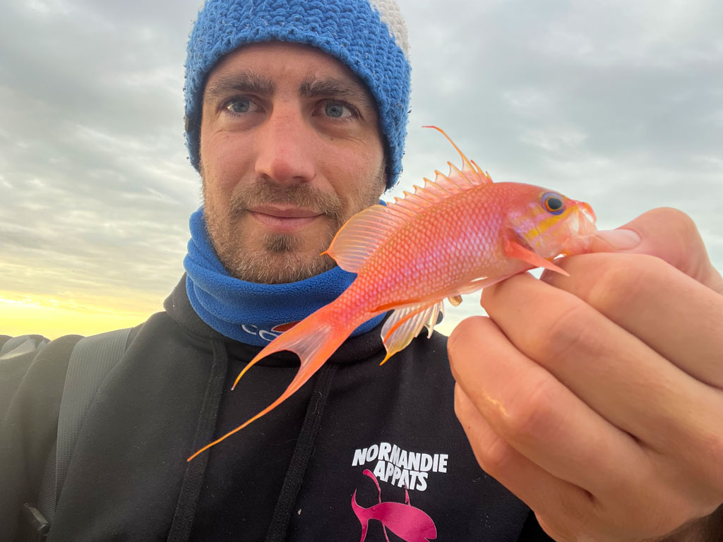 Le membre du team Normandie Appâts a même réussi à prendre un magnifique barbier (Anthias anthias). Ce poisson ne dépasse que rarement les 25 cm mais il est absolument magnifique ! Il est facilement reconnaissable avec sa robe rose vif, sa caudale très échancrée et les lignes jaunes dorées sur sa tête. Un véritable poisson d’aquarium !