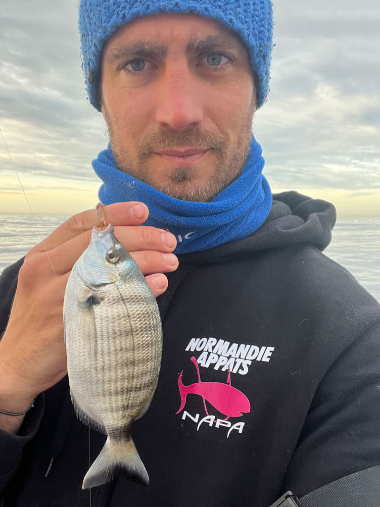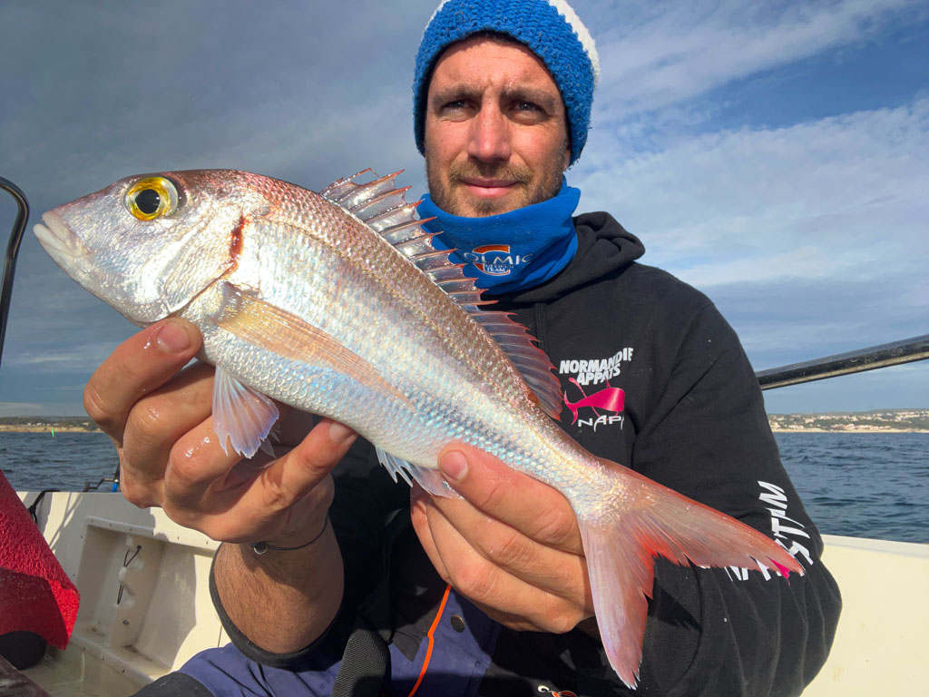 Parmi les nombreux types de sparidés que l’on touche souvent à la palangrotte, Mathieu Courtin a aussi pêché un pageot commun (Pagellus erythrinus). On le distinguera de son cousin le pageot acarné par la trace rouge sur le bord de son opercule et…sa valeur culinaire !