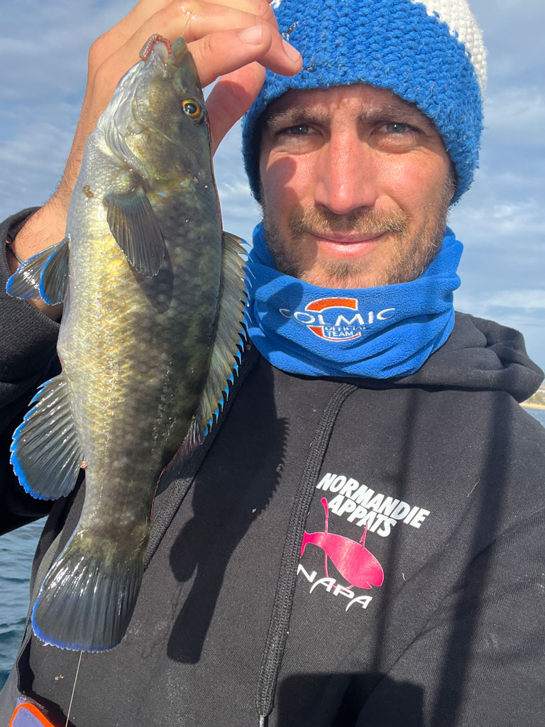 En pêchant à la palangrotte, les labres sont également des poissons qu’on touche fréquemment – surtout à proximité d’herbiers de posidonie. Parmi la très vaste famille des labridés, Mathieu a ici pêché à la Dure Normandie Appâts un beau labre merle (Labrus merula). Ce poisson assez sombre avec les nageoires ourlées de bleu est vraiment superbe !