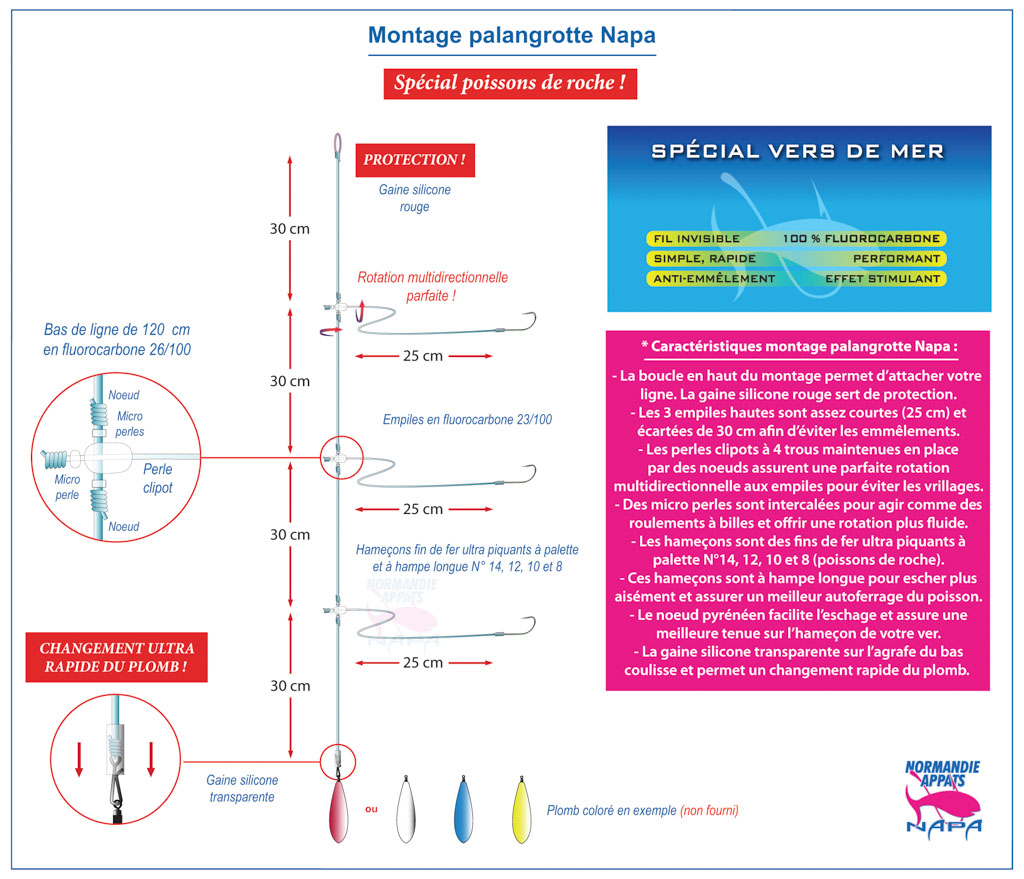 Spécifiquement conçu pour pêcher les petits poissons de roche par des compétiteurs spécialistes de cette technique, le Montage Palangrotte Napa est d’une grande qualité de conception. Il dispose ainsi de 3 empiles afin de multiplier les chances de toucher du poisson dans 3 hauteurs d’eau différentes. La première est surélevée à 30 cm au-dessus de l’attache du plomb afin d’éviter de trop nombreux accrochages sur le substrat rocheux. Ces 3 empiles de 25 cm sont en fluorocarbone 23/100. Ce matériau dont l’indice de réfraction est proche de l’eau garantit à ce montage une discrétion idéale pour les poissons les plus méfiants ! Ces empiles sont maintenues sur le corps du montage avec des roto-perles à 4 trous encadrées de micro-perles. Ce système de fixation garantit une parfaite rotation multidirectionnelle des empiles – ce qui limite grandement les phénomènes de vrillages dus aux courants qui sont si fréquents quand on pêche en bateau. Disponibles en tailles n° 14, 12 ou 10, les hameçons fins de fer ultra piquants correspondent parfaitement aux petits poissons de roche recherchés. Ce sont des modèles à palette afin de permettre un eschage facilité par le pêcheur. De même, ces hameçons ont été choisis avec une hampe longue afin d’avoir un meilleur autoferrage du poisson.