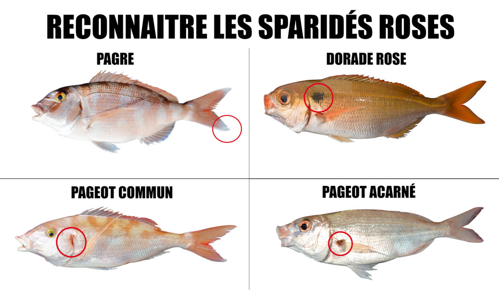 Dorade rose, pageot commun et pagre. Il est facile d’identifier chaque sparidé rose !