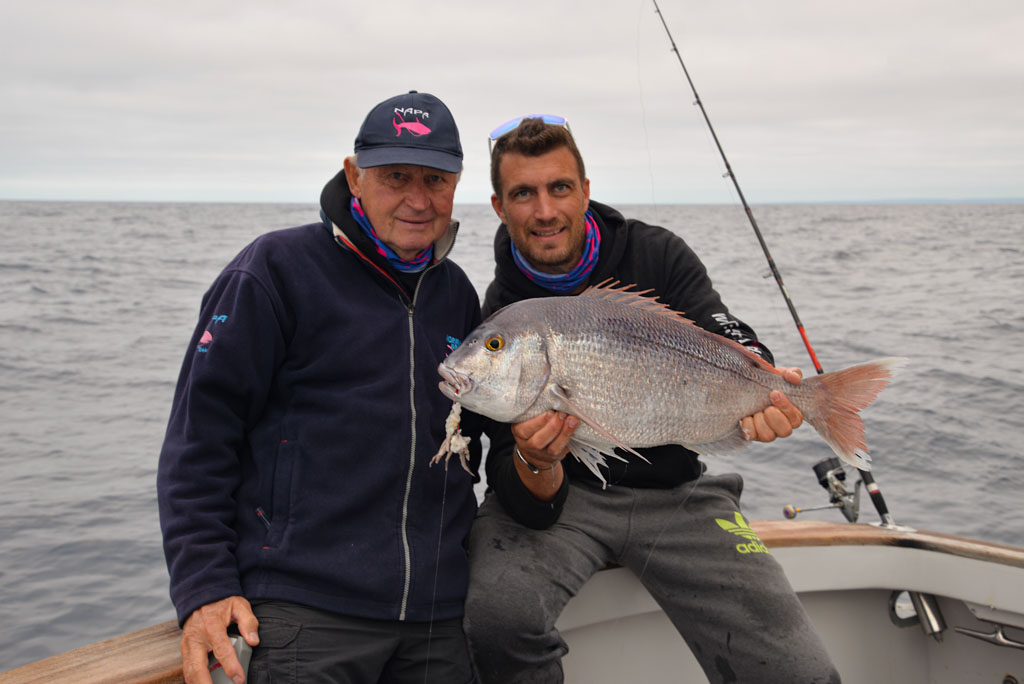 Mathieu Courtin du team Normandie Appâts posant avec un pagre de 5 kg en compagnie de Daniel