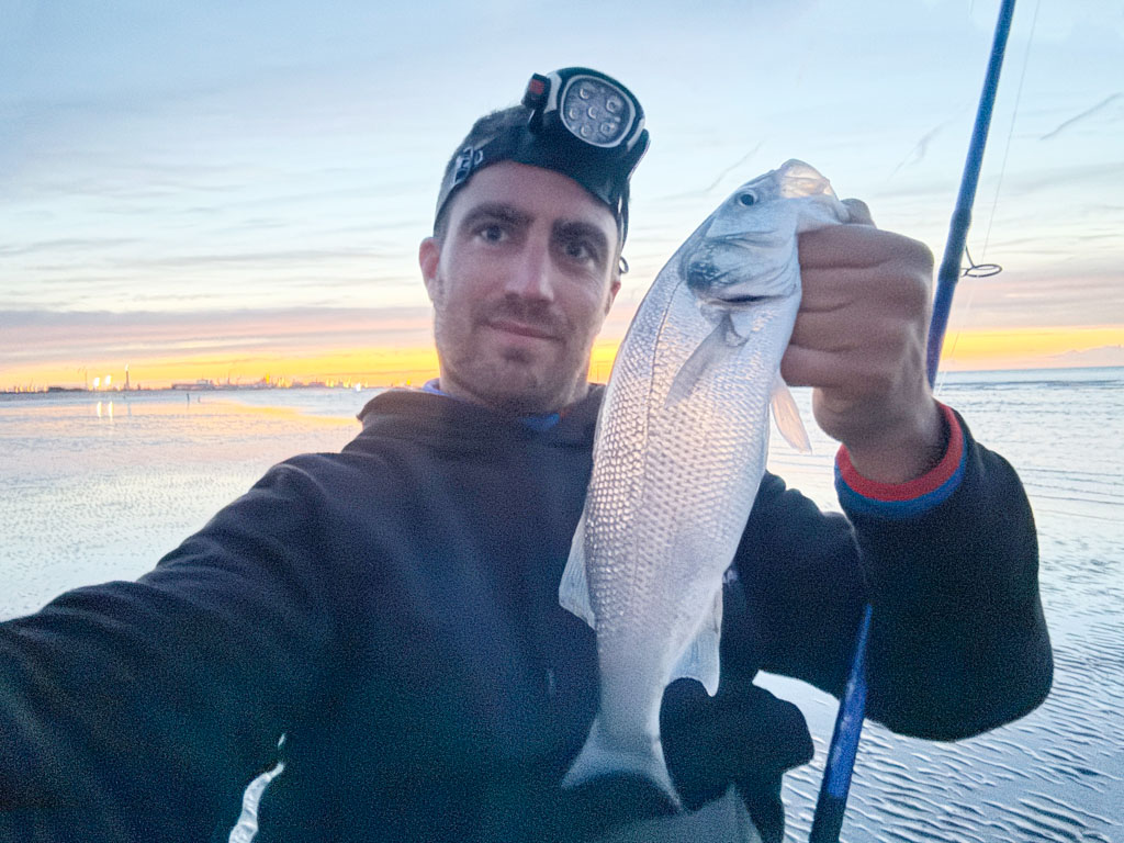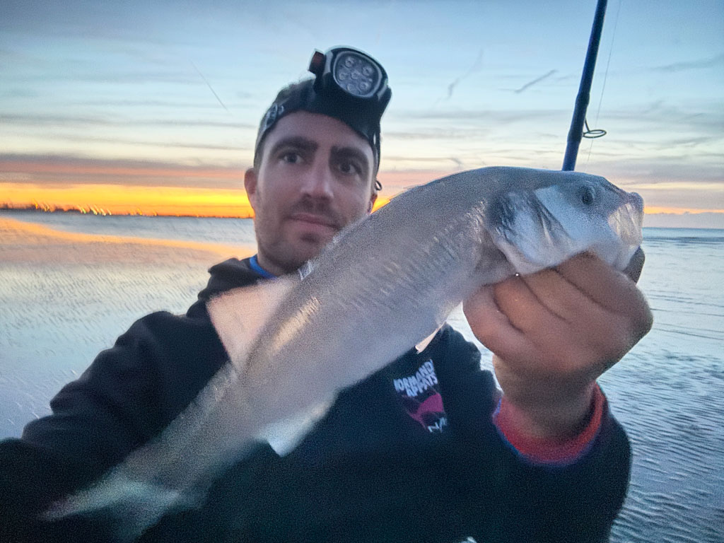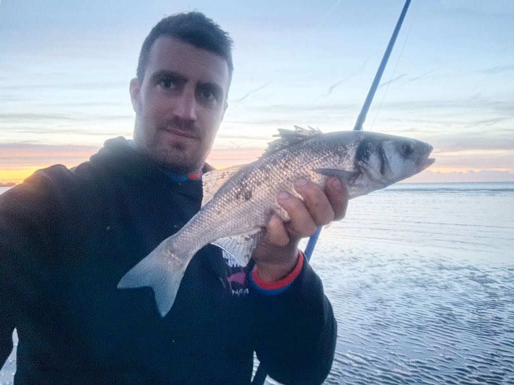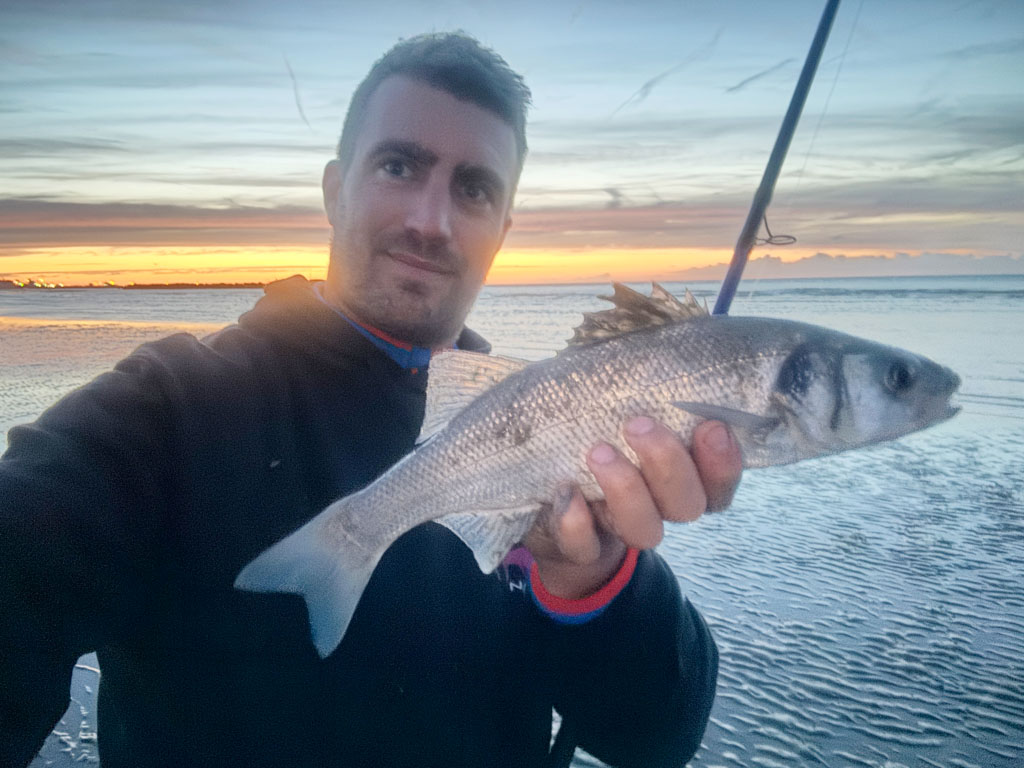 Mathieu Courtin avec un bar franc pêché au Ver noir sur une plage de Dunkerque