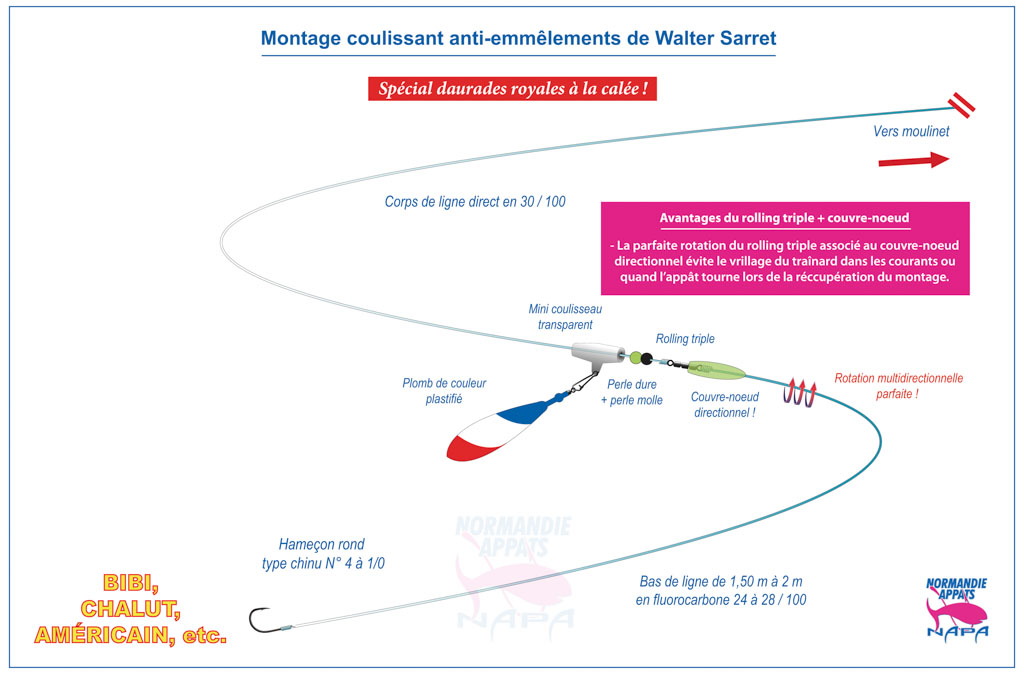 Walter a également remplacé le rolling simple communément utilisé par un rolling triple. Les avantages sont multiples. Ainsi, un rolling triple évite les phénomènes de vrillages du traînard grâce à sa rotation multidirectionnelle parfaite. C’est fréquemment le cas avec un appât tel que le crabe ou un gros Bibi qui s’est tassé sur l’hameçon. Ils tournent en effet lors de la récupération ou en présence de forts courants. Dans ces cas, votre traînard n’offre plus une bonne présentation et il devient nécessaire d’en changer. L’autre atout d’un rolling triple est qu’une fois inséré dans le couvre nœud, l’ensemble ainsi créé constitue une partie rigidifiée sur une bonne longueur. Les risques d’emmêlements entre le coulisseau et le long bas de ligne lors des lancers sont ainsi fortement réduits.