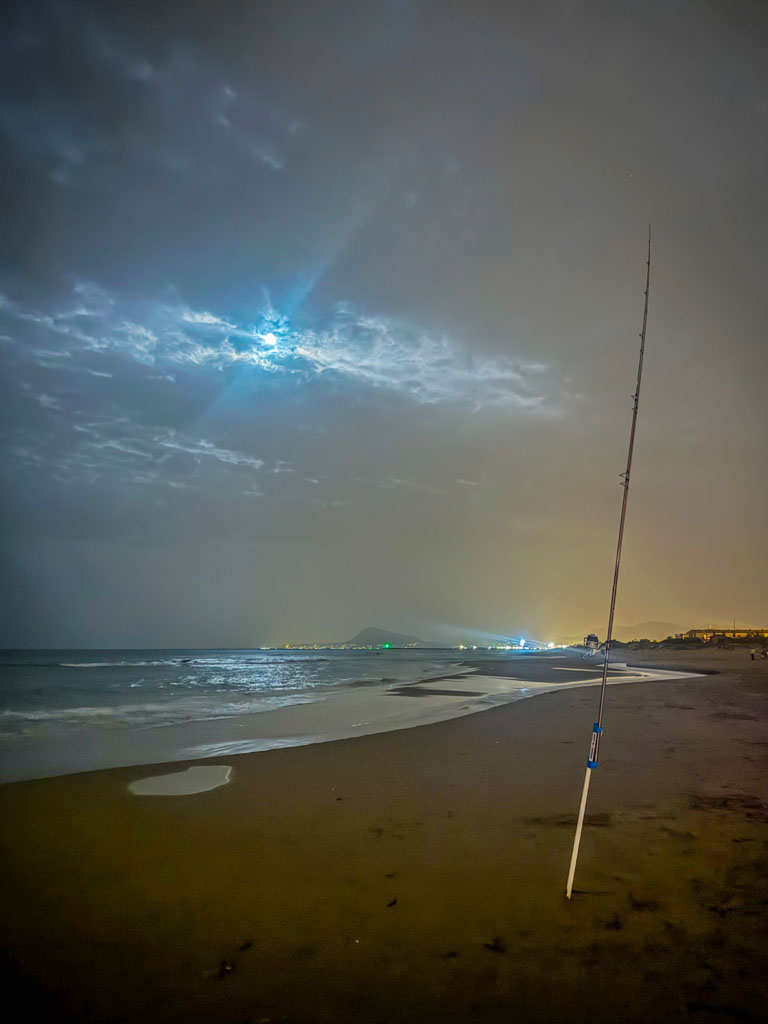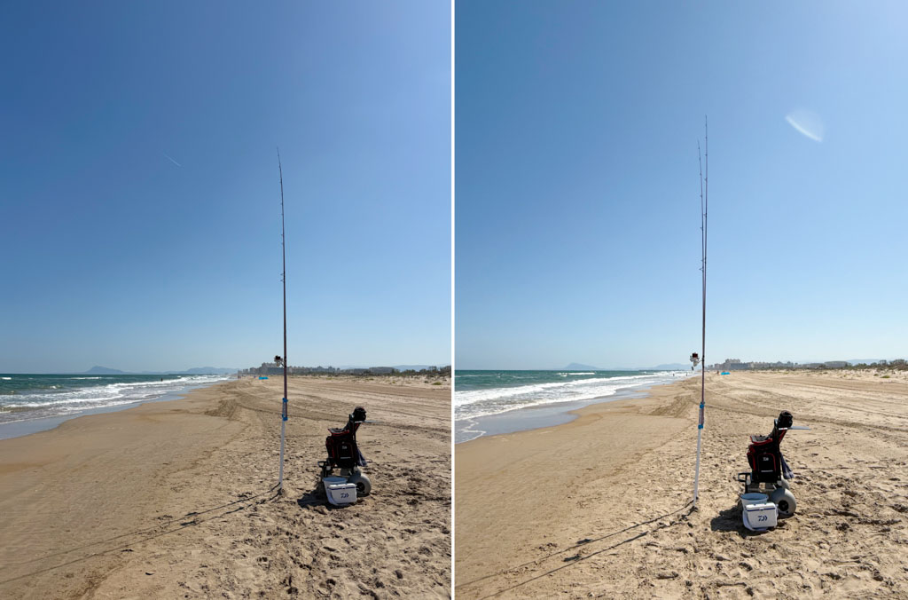 Comme il le fait habituellement lorsqu’il pêche en loisir, Marc a disposé ses cannes parfaitement parallèles et légèrement en arrière. Cette façon de positionner les cannes est typiques des pêcheurs en Espagne. Elle offre de multiples avantages. Elle permet en effet de montrer les touches lorsque le poisson revient vers le pêcheur (touche dite « à revenir ») sans avoir à utiliser un écureuil. Ainsi, le scion bandé se détend lors de ce type de touche et part vers l’arrière. En n’étant plus aligné par rapport à l’autre canne, la touche est alors facilement visible par le pêcheur. En plaçant ainsi ses cannes, la soudaine absence de tension dans la ligne lors d’une touche à revenir fait même que la canne penchée en arrière pivote sur elle-même à cause du poids du moulinet – ce qui alerte encore mieux le pêcheur.