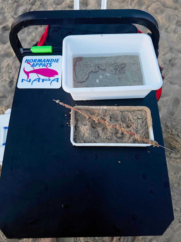 Comme très souvent pour ses pêches les plus fines en plage, Marc a utilisé du Ver de sable Normandie Appâts. Ce ver long et très fin mesure 15 à 40 cm en moyenne. Sa très faible section le rend très aérodynamique et cela contribue à optimiser les distances de lancer. Malgré son apparente fragilité, ce ver supporte très bien les lancers puissants et il offre une excellente résistance à l’hameçon.