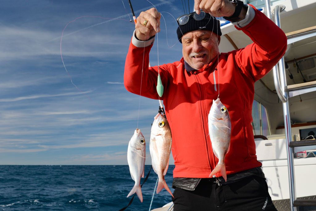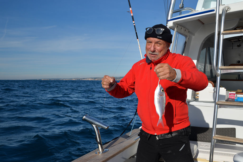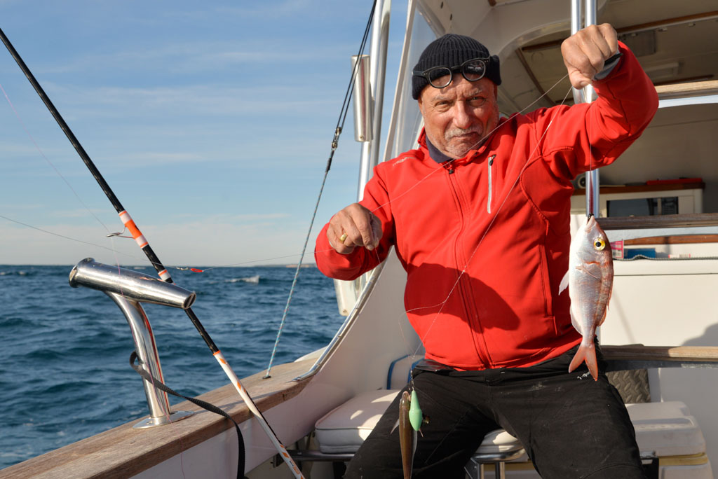 Cette sortie bateau ciblait les sparidés et plus spécifiquement les pageots. Contrairement aux daurades royales qui affectionnent plus les zones rocheuses, les pageots communs (Pagellus erythrinus) évoluent souvent dans des fonds sableux. Durant la saison froide, ils se trouvent dans des profondeurs comprises entre 40 et 80 m. Cette espèce grégaire vivant en bancs parfois importants, il n’est alors pas rare de multiplier les prises une fois qu’on a trouvé un de ces rassemblements.