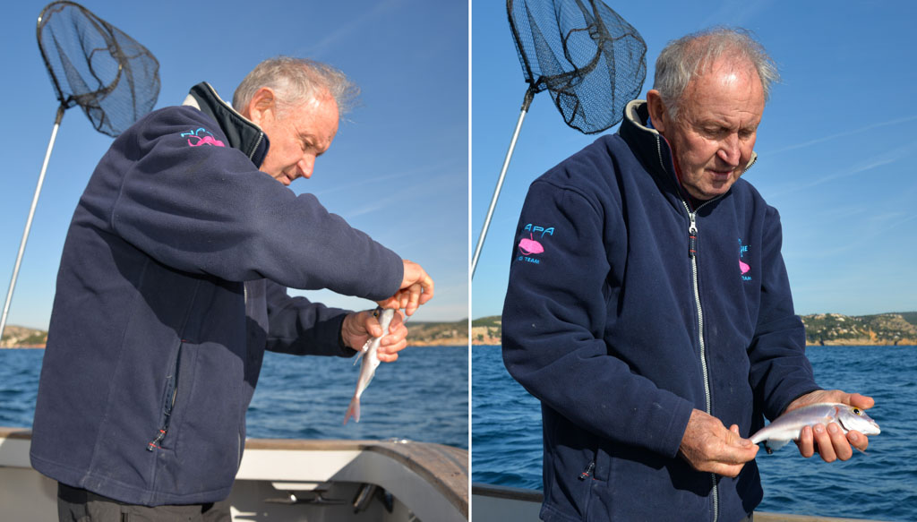 Lors de cette sortie très productive en termes de pageots, Olivier et les autres pêcheurs à bord ont multiplié les prises. Une belle opportunité pour Olivier qui adore la chair de ce sparidé ! Seuls les plus beaux poissons ont été conservés et les individus de moins de 20 cm ont été systématiquement remis à l’eau. Le pageot supporte en fait très bien la décompression et peut se relâcher dans de très bonnes conditions. La taille réglementaire de 15 cm est vraiment petite quand on sait que ce poisson peut dépasser les 60 cm. Le pêcheur respectueux de la ressource aura donc à cœur de ne conserver que les plus beaux individus, - sachant que cette pêche peut être très prolifique.