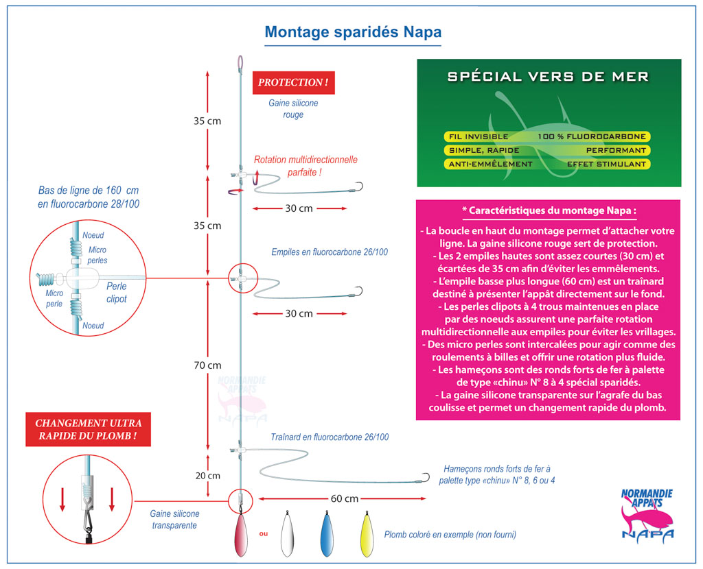 Tout dans la composition de ce montage a été spécifiquement pensé pour la pêche des sparidés. Ainsi, il est entièrement réalisé en fluorocarbone. Avec son indice de réfraction très proche de celui de l’eau, ce matériau offre un maximum de discrétion – ce qui le rend idéal pour les sparidés connus pour leur grande méfiance. La résistance à l’abrasion du fluorocarbone est aussi un réel atout face à leur mâchoire pavée. En haut, ce montage sparidés Napa dispose de 2 empiles assez courtes (30 cm) en 26/100. Celles-ci sont écartées de 35 cm afin d’éviter les emmêlements. En bas, il présente un traînard plus long (60 cm) en 26/100 qui permet de présenter l’appât directement sur le fond. Vous pêchez donc sur le substrat mais aussi dans 2 autres couches d’eau : autant de chances de toucher du poisson !